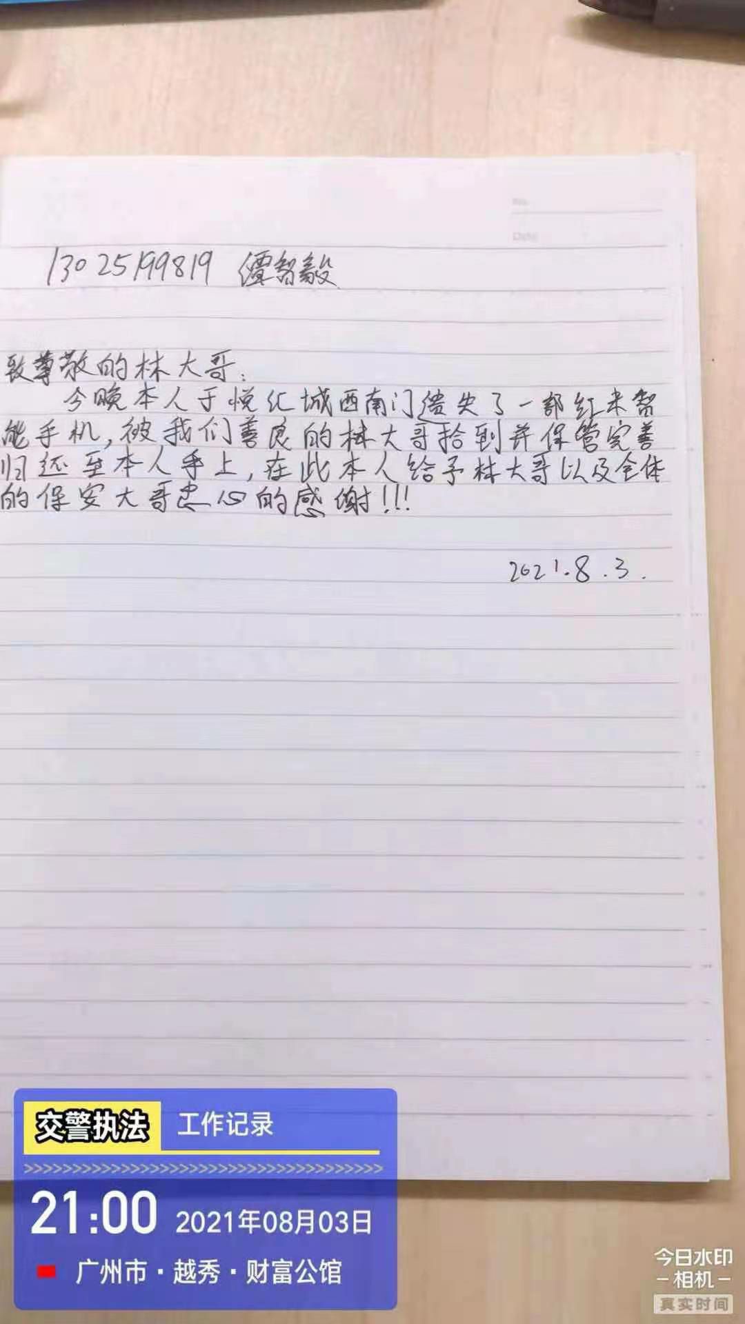 2021年8月3日,首页 | 尊龙集团官方官网-尊龙(中国)一站式服务官方网站驻西村悦汇城保安员林伟强像往常一样准备交接岗,当走至负一西南门门口的时候发现地上有一部黑色智能手机,林伟强在现场等待失主并上报了当班值班经理,不一会儿失主打电话过来,核实了失主身份后将失物归还。失主十分感动,并现场手写感谢信一封以表谢意。
